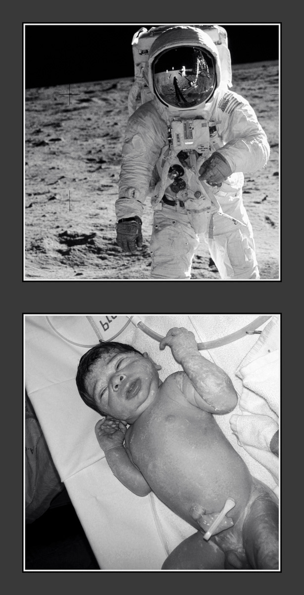 Two beginnings. The first step beyond the planet and the first breath of a naked body. Fragile humanity shielding itself with an artificial skin — the spacesuit — like a second birth, artificial yet necessary.