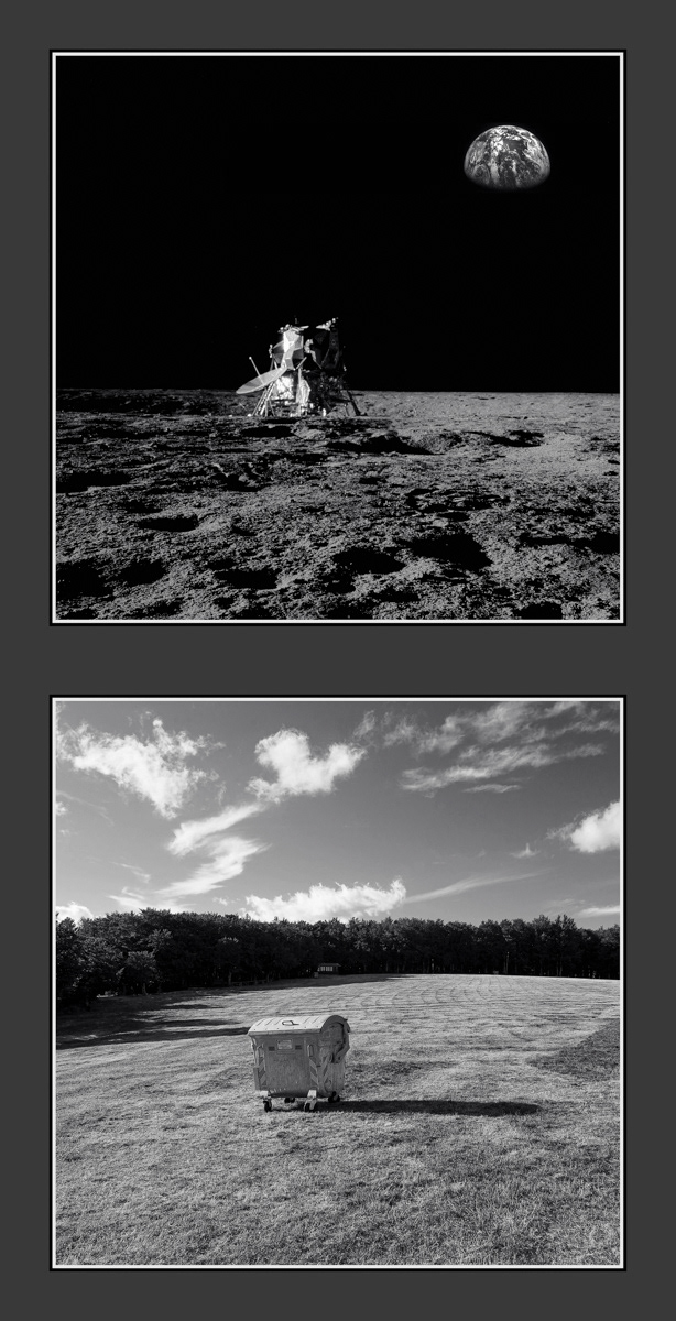 From glory to residue. The most advanced technology and the humblest waste are equivalent, both abandoned. The Moon and the Earth reveal themselves as repositories of the same human inability to distinguish between conquest and discard.