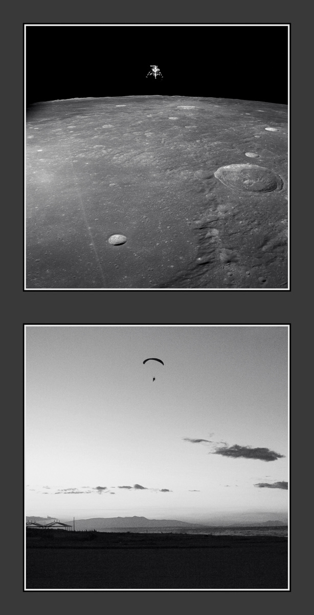 Il veicolo spaziale all’orizzonte e il fragile paramotore che si stacca dalla riva: due gradi dello stesso sogno atavico. Dal desiderio di volare al compimento di Icaro, l’umanità ha finalmente spezzato i vincoli della gravità.