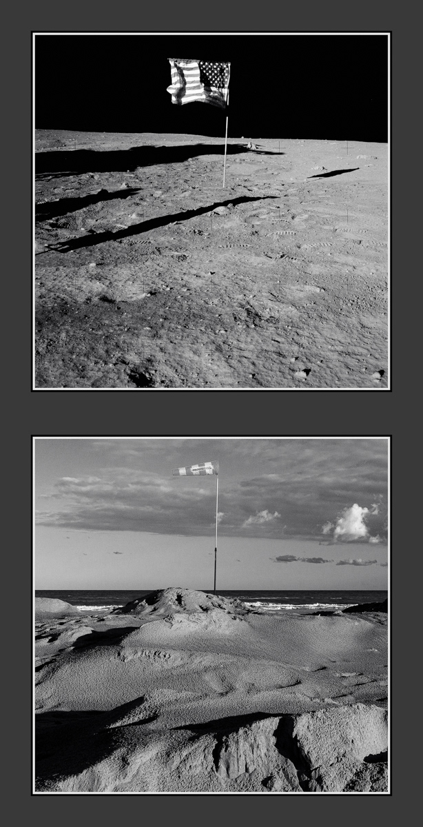 Due vessilli piantati: simboli di conquista, possesso, orientamento. Da un lato il gesto politico che dichiara la Luna “occupata”, dall’altro la bandiera che indica al pilota la via per decollare. Entrambe parlano di successo e dominio, ma anche di guida verso la conquista.