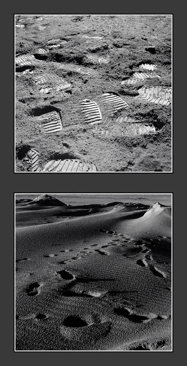 Traces that strive to endure. The desire to leave a mark is the same, whether on the Sea of Tranquility or on the shore. It is the metaphysical urgency not to disappear.