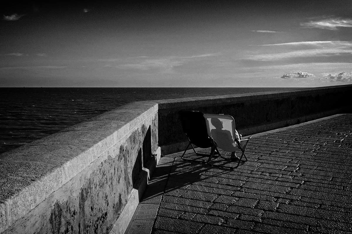 Due sedie al confine tra terra e mare. Due figure siedono fianco al mare, ma non lo guardano: volgono lo sguardo verso il sole, verso l’accecante lampo che dà il titolo all’opera. Non è l’orizzonte a definirle, ma la fonte stessa della luce. La luce qui non si limita a illuminare, ma rivela: proietta ombre che non appartengono solo al corpo, ma al suo inconscio. L’inconscio non può essere nascosto: si proietta sempre, anche quando non ne siamo consapevoli. Così il mare diventa presenza laterale, muto testimone, mentre il muretto segna un confine, una soglia tra sicurezza e abisso. Ma i corpi non cercano protezione: si abbandonano al bagliore, come in un rito arcaico, in cui esporsi alla luce significa accettare la vulnerabilità dell’essere. Il “flash” è duplice: lampo esterno e rivelazione interiore. Non è il fotografo a scattare, ma l’esistenza stessa che imprime nelle figure un istante di verità. La fotografia diventa allora meditazione: la verità non si trova solo nella chiarezza della luce, ma anche nella densità dell’ombra. È lì che si riflette la nostra parte più segreta, che ci precede e ci accompagna. In quell’attimo, lo spettatore non vede solo due persone sedute, ma riconosce la condizione universale: l’uomo posto accanto al mistero del mare, ma rivolto al mistero ancora più grande della luce che lo rivela.