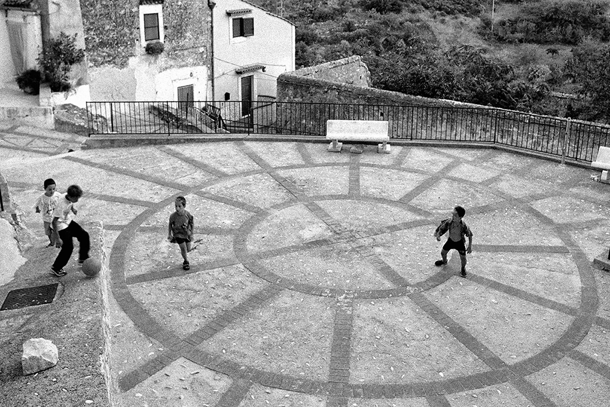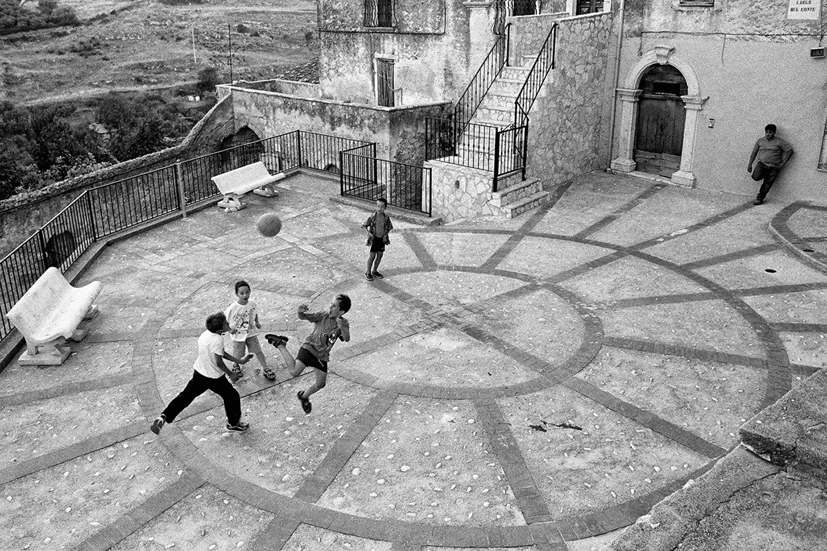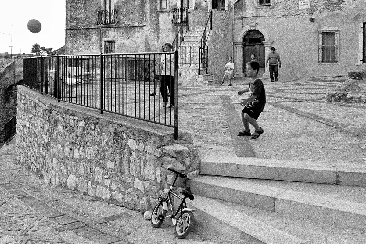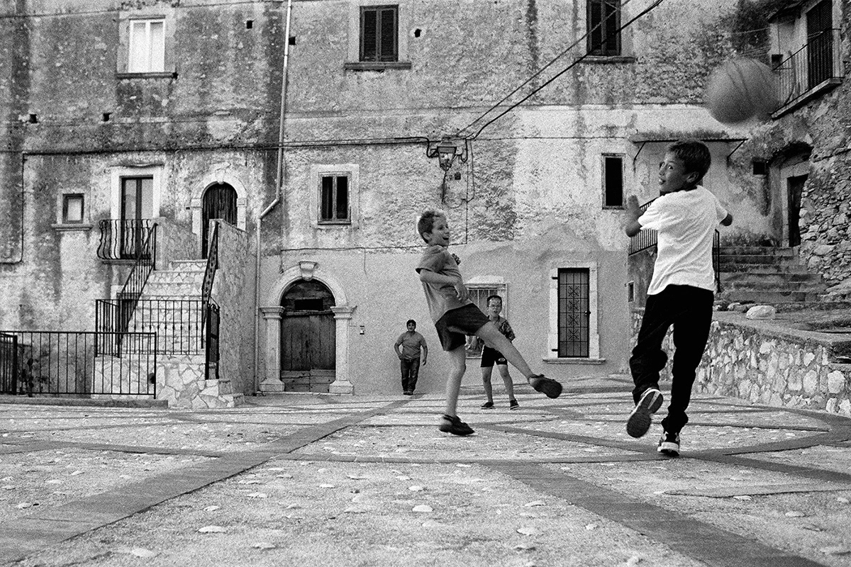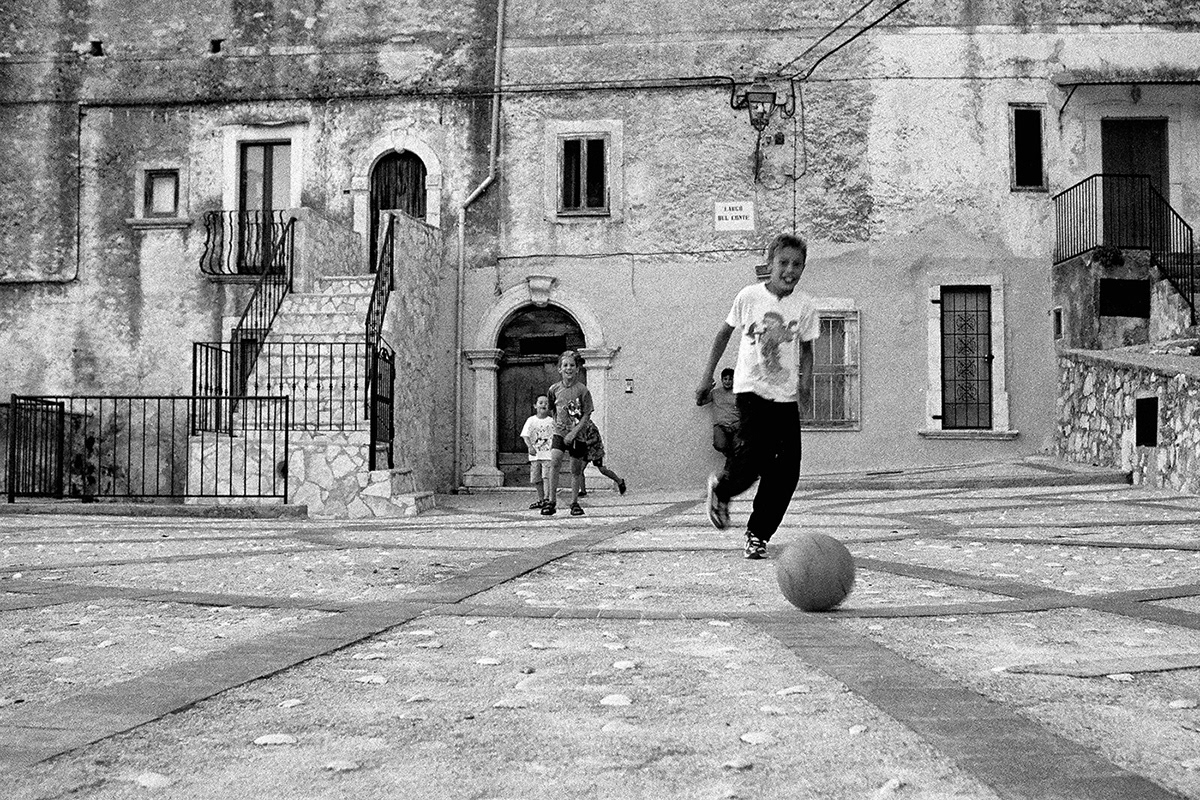 Una piazzetta. Crogiolo d’incontri adolescenziali e di esperienze intense, dove nell’allegria più semplice giovani gioiosi vivono inconsciamente le prime prove di vita: il confronto, l’amicizia, le prime attrazioni e repulsioni verso un mondo ancora da scoprire. All’improvviso il gioco si interrompe. Il pallone si perde tra le case, inghiottito dai vicoli come i sogni che svaniscono. In quell’attimo si consuma la metafora più crudele: con il pallone si smarrisce anche un frammento di giovinezza, destinato a non tornare più. Niente e nessuno potrà appagare il pianto del bambino cui sfugge, tra i meandri dell’esistenza, il simbolo stesso della sua spensieratezza. I compagni, attoniti ed esterrefatti, rimangono ammutoliti, aggrappati alle barriere come a un fragile confine tra l’infanzia e il tempo che avanza. Eppure, nel silenzio sospeso, permane una certezza: presto il gioco ricomincerà, perché la vita, nonostante le sue fughe e i suoi crepacci, trova sempre il modo di riaffacciarsi nello spazio della memoria e dei giorni futuri.